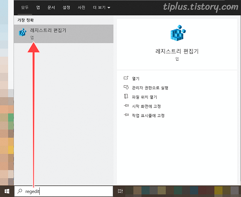 저와 정확히 같은 로그를 확인했다면, 윈도우 10을 기준으로 아래쪽 검색 바에 regedit을 입력하여 레지스트리 편집기를 실행합니다.