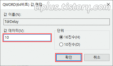 여기서 이 값을 16진수건, 10진수건 관계 없이 10으로 넣고 확인을 눌러주면 해당 에러는 해결할 수 있다고 하네요. 16진수로 넣는다면 딜레이가 16초, 10진수로 넣는다면 딜레이가 10초인데 애초에 기본 값은 2초이므로 대폭 늘어난다고 보면 되겠습니다. 정 거슬린다면 16진수일 경우는 A, 10진수의 경우는 10을 넣어 권장값인 10으로 맞추는 것도 방법입니다.