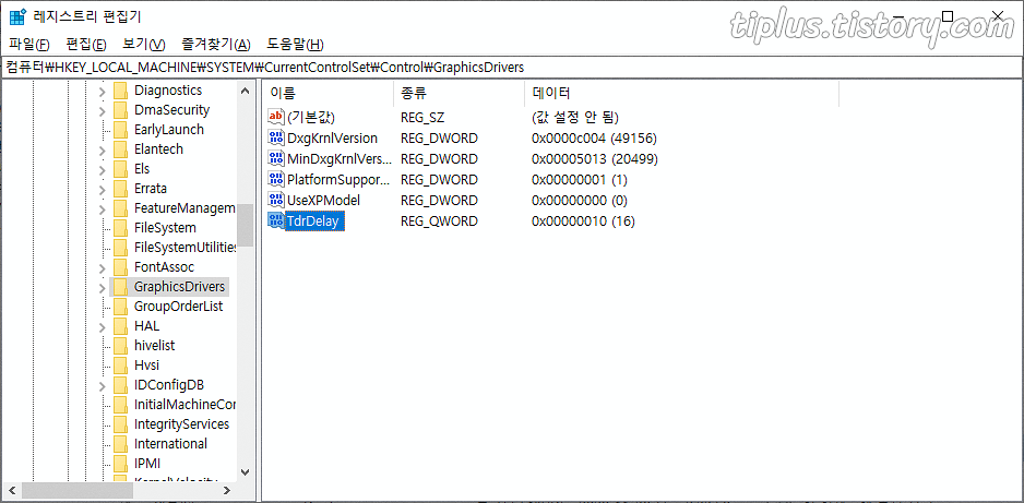 마지막 Control 폴더의 아래쪽을 보면 GraphicsDrivers라는 폴더가 있습니다. 이 폴더를 우클릭하여 자신의 컴퓨터 비트 값에 맞는 값을 만들어줍니다.