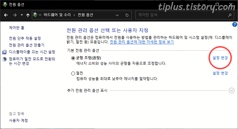 여기서 중요합니다. 저는 균형 조정에 맞춰놓고 쓰고 싶어서 '균형 조정의 설정 변경'을 눌러 들어가지만, 권장 설정은 아래에 있는 '추가 전원 관리 옵션 표시'를 통해 나오는 '고성능 설정을 사용하라' 입니다. 아무튼 전 권장값인 고성능에 맞추는 것은 하지 않았습니다만, 권장은 고성능 전원 옵션 설정입니다. 명심하세요. 사용할 전원 옵션을 선택했다면, 우측의 설정 변경을 선택해봅시다.