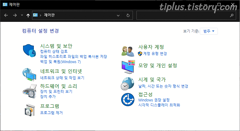 제어판이 열렸습니다. 윈도우의 대부분의 기능들은 기본적으로 우상단에 검색 바를 포함하고 있기에 메뉴를 통해 일일이 찾아 들어가지는 않을 것입니다.