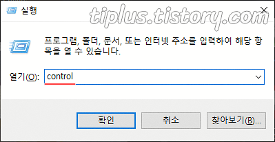 앞서와 마찬가지로 다시 Windows + R 키를 이용하여 실행 창을 불러옵니다. 여기서 control을 입력하고 확인을 누르면 제어판을 바로 열 수 있습니다. 또는, 편한 방법대로 찾아가도 결과는 같으므로 무관합니다.