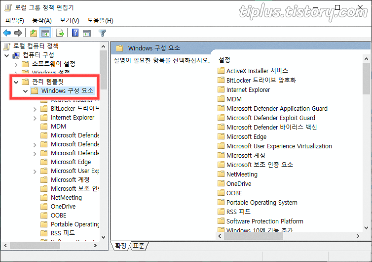 먼저, 왼쪽 메뉴에 있는 관리 템플릿 → Windows 구성 요소 순서대로 이동합니다.