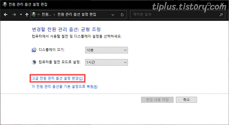 바로 이어서 들어와보면 디스플레이를 끄는 시간 등을 제어해볼 수 있는데, 아래에 있는 '고급 전원 관리 옵션 설정 변경'을 선택해보면 전원 옵션 창이 하나 뜹니다.