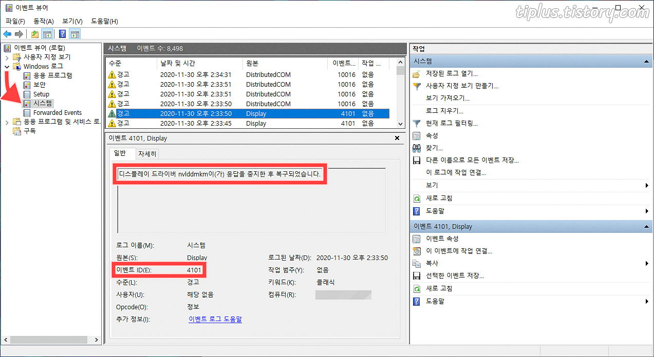 첫 번째 - 이벤트 ID 4101(원본 : Display) - '디스플레이 드라이버 nvlddmkm이(가) 응답을 중지한 후 복구되었습니다.'가 확인되는 경우