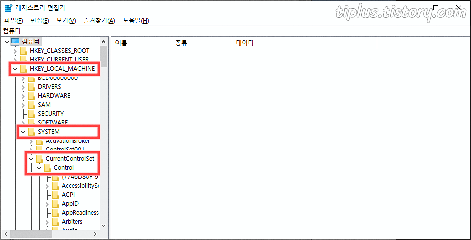 여기서 위 경로를 순서 그대로 따라갑니다. HKEY_LOCAL_MACHINE ▶ SYSTEM ▶CurrentControlSet ▶Control 까지 들어왔다면 아래 설명을 이어서 따라가주세요.