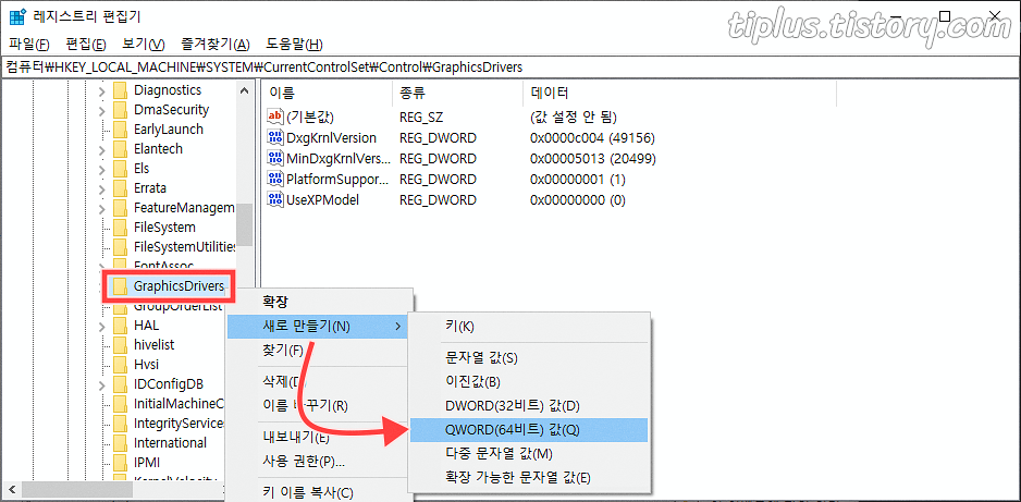 마지막 Control 폴더의 아래쪽을 보면 GraphicsDrivers라는 폴더가 있습니다. 이 폴더를 우클릭하여 자신의 컴퓨터 비트 값에 맞는 값을 만들어줍니다.